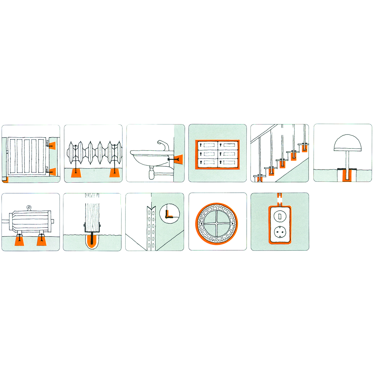 Рамки на врати, декоративни и защитни решетки, радиатори, сенници, щори, тоалетни и биде опори, гаражни врати, пощенски кутии, парапети и опори, външни светлини, огради, резервоарни системи, вътрешни и външни канализационни системи, домофони, тръби, кабели, комин корици и др.